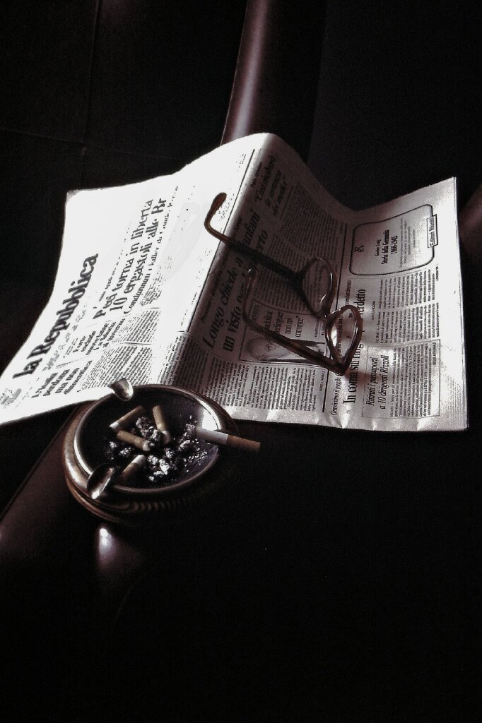Eravamo negli anni 70-80 sulle prime pagine dei giornali primeggiavano le vicende delle "Brigate" rosse, Papà leggeva il giornale seduto sulla sua poltrona preferita, in salotto. Io ero seduto di fronte sull'altra poltrona e lo guardavo. Sempre con la sigaretta in bocca era assorto. All'improvviso si alzò appoggiò il posacenere sul bracciolo della poltrona insieme alla sigaretta, si tolse gli occhiali che appoggoiò insieme al giornale sullo stesso bracciolo e uscì dalla stanza. Con la mia fedele fotocamera scattai, per ricordare.